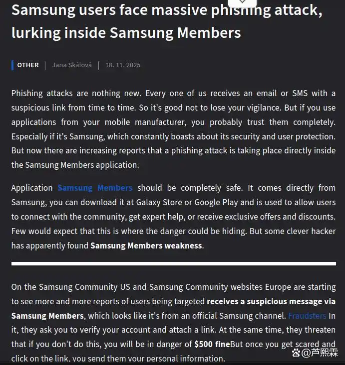 2025年11月,Samsung Magazine 报道多起用户在 Samsung Members 应用中遭遇钓鱼攻击的事件。Samsung Members 是 Galaxy 设备预装的官方社区与支持平台,提供产品资讯、故障排查、专属优惠等功能。攻击者在该应用内发送伪装成“三星官方”的消息,声称“账户存在异常需立即验证”或“参与活动赢取 Galaxy S26”,并附带指向伪造登录页的链接。由于消息出现在官方应用界面中,且使用三星品牌元素(Logo、配色、术语),大量用户未加核实即点击链接并输入 Samsung 账户凭证,导致账户接管与数据泄露。