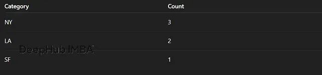 "city": ["NY", "LA", "NY", "SF", "LA", "NY"],