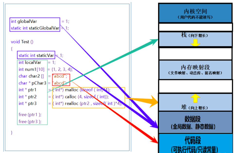 static int static_uninit;堆(Heap) 动态内存:通过 malloc、calloc、realloc 分配,需手动释放。