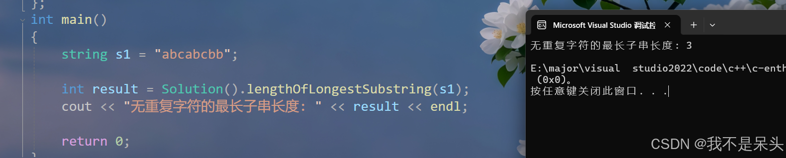 cout << "无重复字符的最长子串长度: " << result << endl;
