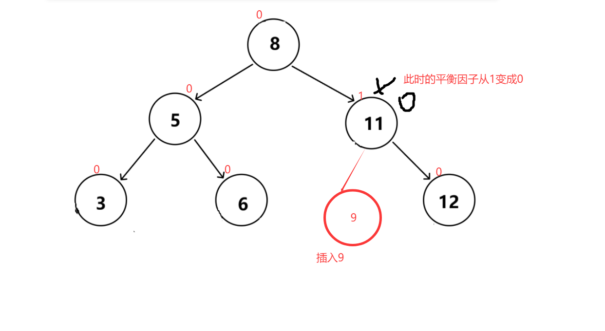 当parent的平衡因子由0->1或0->-1,表示在插入前,左右子树高度相同;而插入新节点后,导致其中的一边高度增加1,parent变得一高一低。尽管此时parent子树任然保持平衡(平衡因子的绝对值小于等于1),但是该子树的高度整体增加了1,这样高度变化将传递给更高层的父节点。即需要继续向上更新祖先节点的平衡因子。
