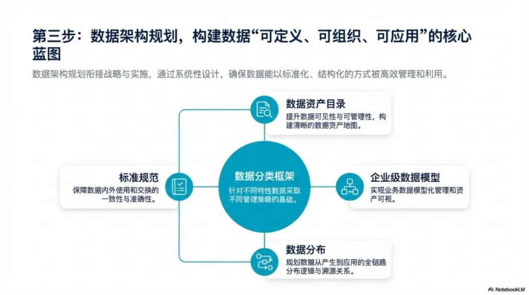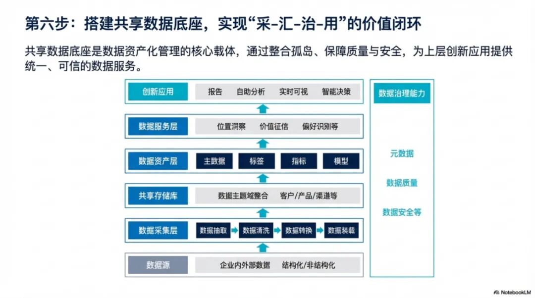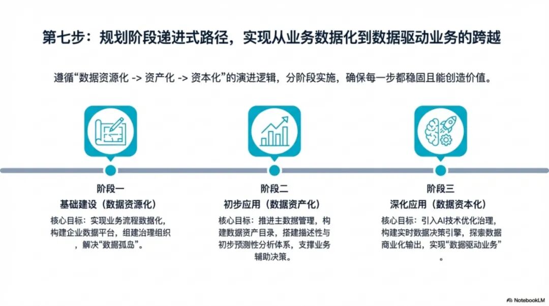 核心任务是"把数据管起来"。重点是将线下业务搬到线上,实现业务流程数字化;建设数据平台,汇聚各系统数据;组建治理团队,制定基础标准规范。这个阶段的目标是解决"数据孤岛"问题,让数据看得见、找得到。