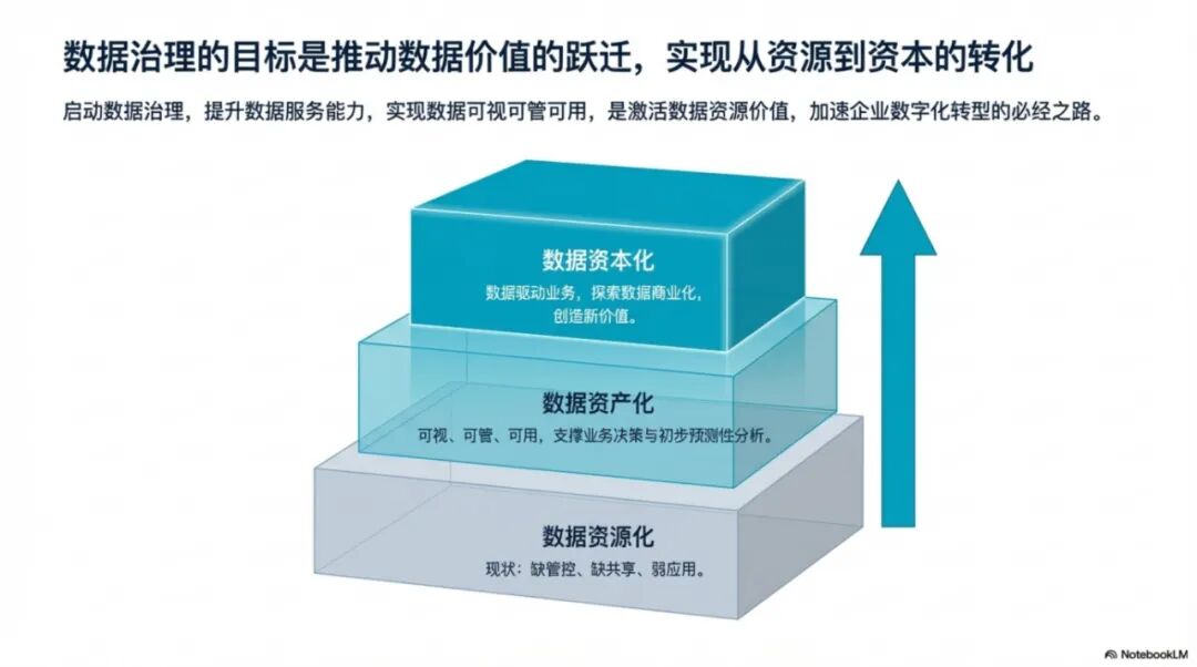 详细阐述了企业如何系统地规划和落地数据治理工作,指出数据治理是解决数据分散、保障数据价值最大化,并实现数字化转型的关键。规划流程要求从全面的数据诊断与评估开始,确定数据现状和治理成熟度,并依此制定清晰的治理战略、目标和实施路线图。核心内容包括设计统一的数据架构,如数据分类框架和数据标准规范,以及构建关键的治理支撑能力,重点覆盖元数据管理、数据质量管理与数据安全管理。同时,为确保治理的有效性,企业必须建立健全的数据管控架构,明确数据认责体系和治理制度流程。最后,文章强调需遵循阶段递进式路径,引导企业数据从“资源化”阶段逐步演进至“资产化”和“资本化”,最终通过技术平台支撑实现价值闭环。