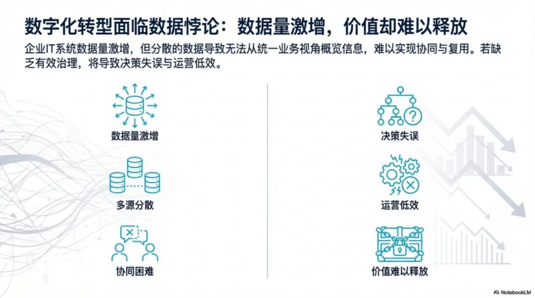 随着业务发展,企业积累了海量数据,但往往陷入"数据多却用不好"的尴尬境地。具体表现为: