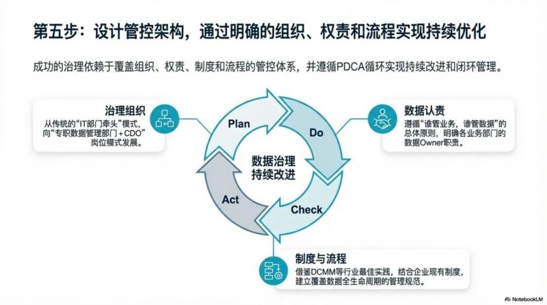 数据认责。明确每个数据集的责任部门和责任人,谁产生的数据谁负责,谁使用的数据谁维护,避免"人人都管等于没人管"。