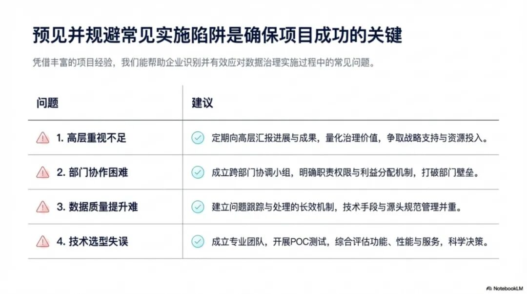 部门协作困难:数据治理打破了部门边界,涉及利益调整,容易遇到阻力。建议建立跨部门协调机制,明确利益分配规则,通过联合项目促进协作。