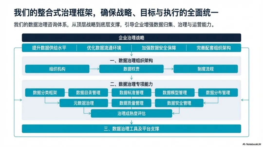 企业数据治理需要构建一个完整的体系,包括三大核心层面和九大专项治理域: