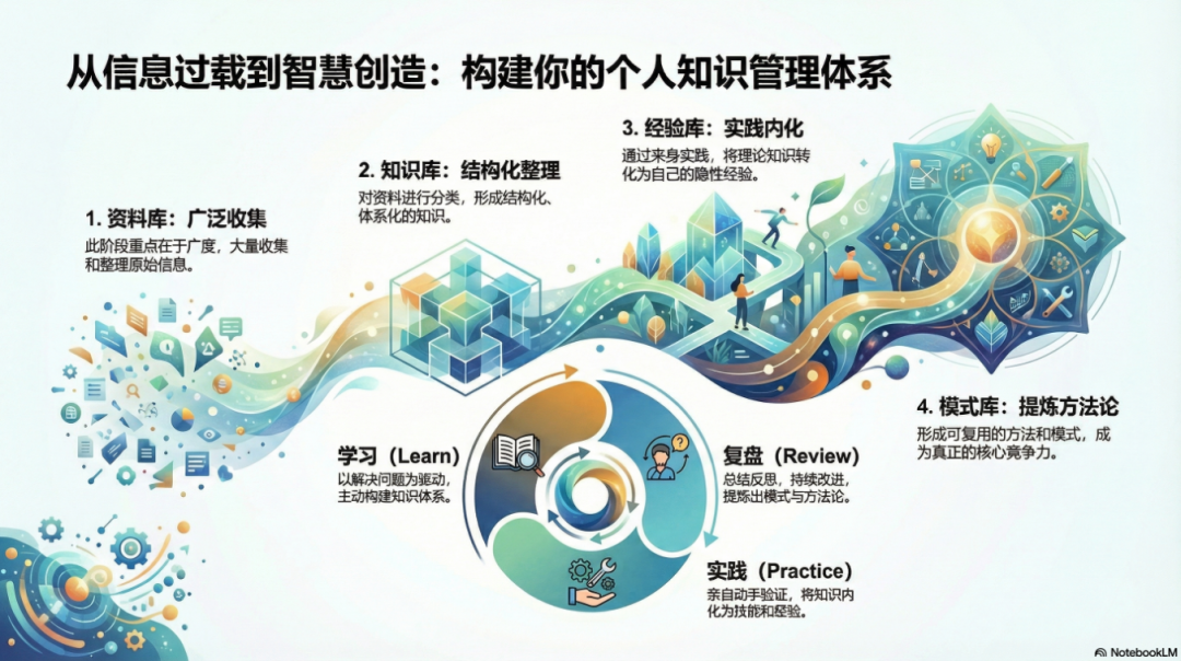 • 模式库:这是知识演进的最高形态。在丰富的经验基础上,我们开始总结、提炼并形成可复用的方法论和模式。这些模式代表了我们对事物本质规律的深刻洞察,是解决一类问题的通用“算法”,也是个人核心竞争力的终极体现。