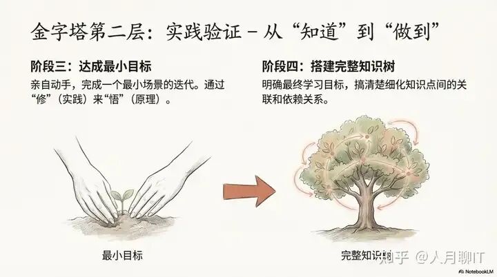 此阶段的核心是**“及早启动实践”**。我们不必等到所有理论都学完才开始动手,而是应该尽快设定一个假想场景下的最小可行目标,并立即付诸行动。其核心原则在于: