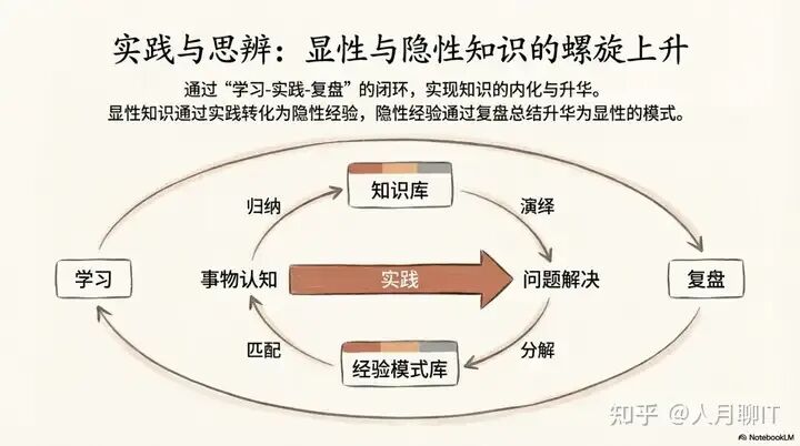 • 思辨(复盘):实现闭环和螺旋上升的关键。实践之后,我们必须停下来深入思考:理论在实践中应用得如何?有哪些不足之处需要调整?通过体系化的总结,我们提炼出最适合自己的方法论,并为下一轮更高阶的学习指明方向。