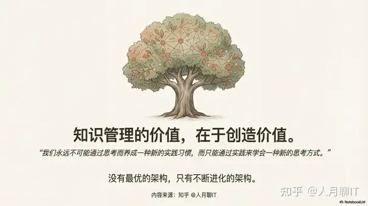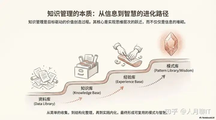 我们必须明确一个核心观点:知识管理本身没有价值,其价值在于附属和应用于具体的业务或技术领域,以创造实际成果。学习金字塔正是实现这一演进路径的具体操作框架,它指引我们如何一步步将资料转化为真正的智慧。