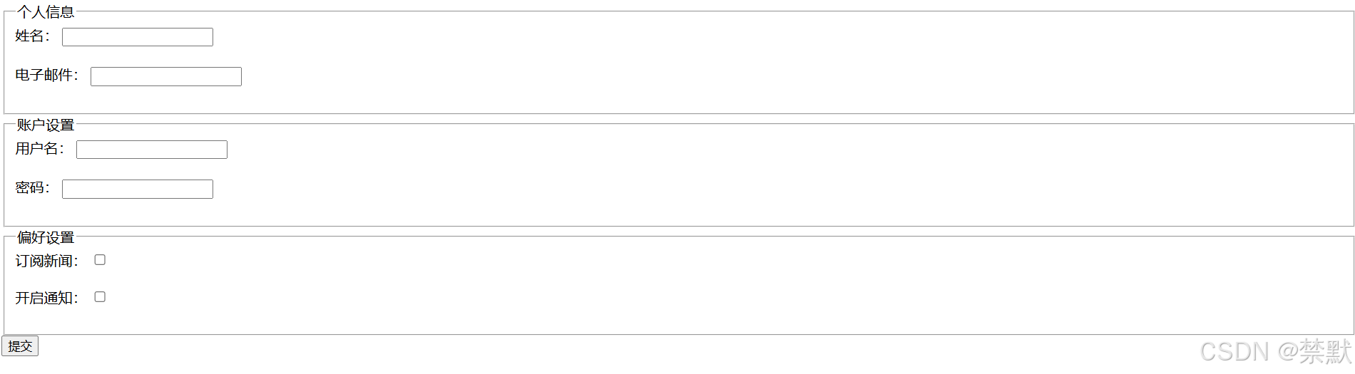 我们将展示一个包含多个分组区域的表单,通过<fieldset>和<legend>标签来增强表单的可读性和结构化。
