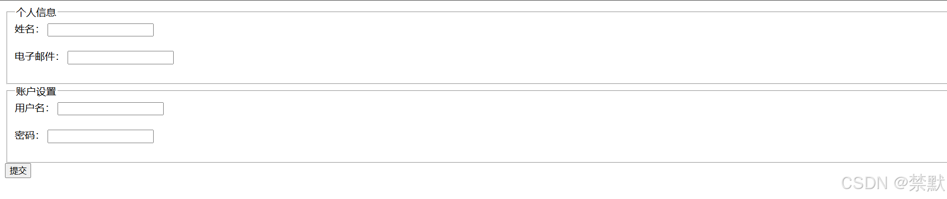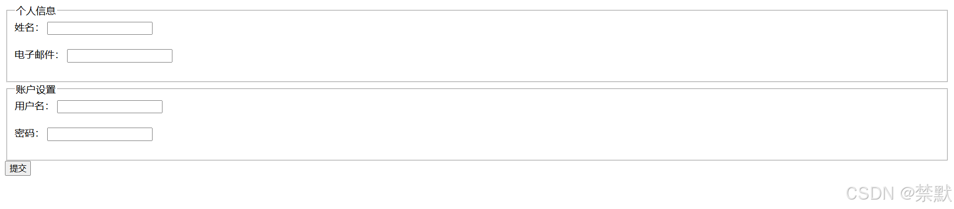 </form>在这个例子中,表单被分为两部分:个人信息和账户设置。每一部分都有一个<fieldset>标签来分隔,视觉上帮助用户快速识别和理解不同部分的功能。