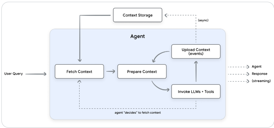 图中展示了上下文管理流程:获取上下文、准备上下文、调用LLM和工具、上传新信息。这一循环确保Agent始终基于相关数据操作。