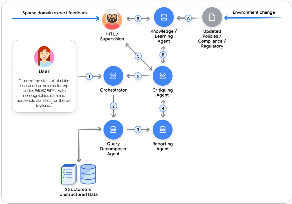图中展示了多Agent合规工作流:查询Agent获取数据,报告Agent生成草稿,评审Agent检查合规性,学习Agent从反馈中进化。