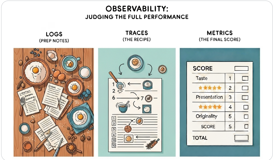 - 追踪:连接日志的“叙事”,显示端到端执行路径。OpenTelemetry等标准支持。