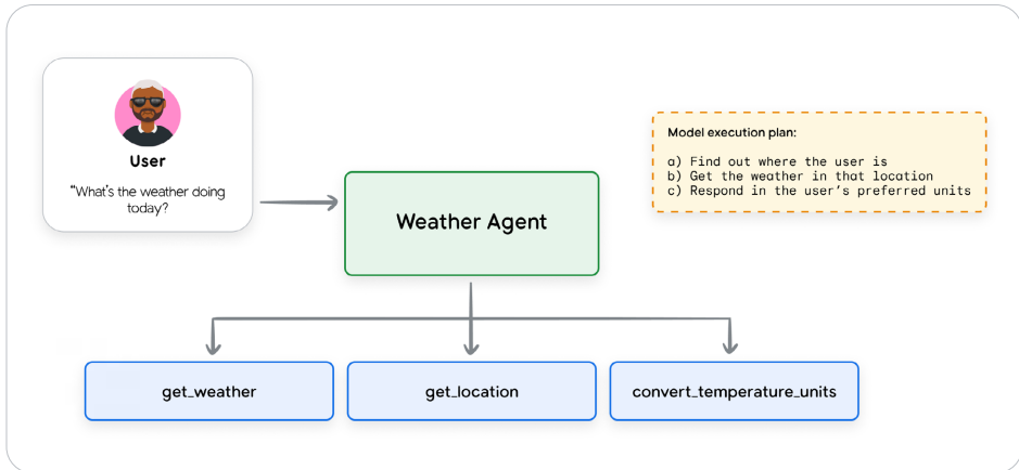 - 工具(手):工具连接Agent与现实世界,分为信息检索(如RAG、NL2SQL)和行动执行(如发送邮件、运行代码)。工具通过函数调用集成,需清晰定义名称、参数和描述。例如,天气查询工具需包含位置参数和温度单位说明。