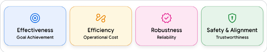 图中展示了Agent质量的四大支柱:有效性、效率、稳健性、安全性。全面评估需覆盖所有维度。