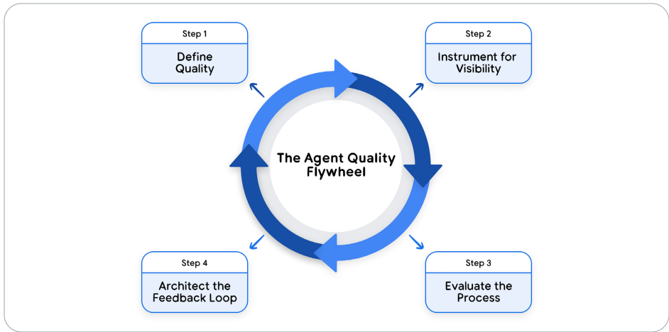 图中描绘了Agent质量飞轮:定义质量目标、仪器化可观测性、评估过程、构建反馈循环。飞轮驱动持续改进。
