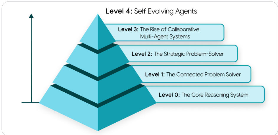 图中使用分层金字塔模型,用于呈现不同层级的智能系统(或问题解决能力)的发展阶段:底层是基础支撑,越往上层,系统的复杂性、自主性与智能程度越高。