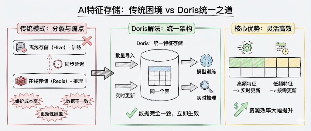 离线特征存储用于模型训练,在线特征存储用于实时推理,两套系统维护成本高,数据一致性也难保证。更关键的是,当你需要在线更新某些特征时,传统的在线存储系统性能往往捉襟见肘。