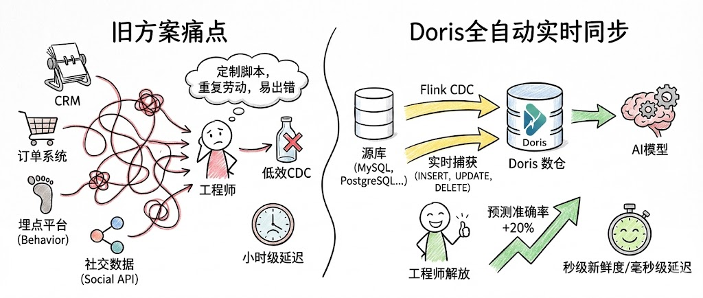 切换到Doris的整库同步方案后,工程师解放出来专注于模型优化,而数据新鲜度从小时级提升到秒级,AI预测的准确率提升了20%。