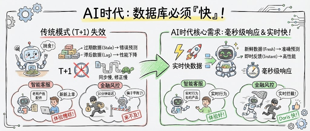老板要看今天的实时用户画像数据,AI推荐模型等着用,但我这边T+1的ETL流程还没跑完。" 产品经理小李头也不抬:"那就告诉他明天再看呗。" 老张苦笑:"你是没看到,竞争对手的AI推荐系统已经做到了秒级响应,我们还在用昨天的数据喂模型,这仗怎么打?" AI时代的数据库,说穿了,首选就要解决一个最直接的问题——快。不是什么云里雾里的概念,而是当AI模型嗷嗷待哺的时候,你能立刻把最新的分析数据喂进去。