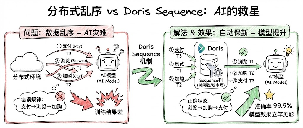 Doris通过Sequence列机制,彻底解决了这个让AI工程师头疼的问题。你可以指定一个时间戳或版本号字段,Doris会自动识别并保留时间最新的那条数据。即使数据乱序到达,最终存储的永远是按照业务逻辑正确的那个状态。