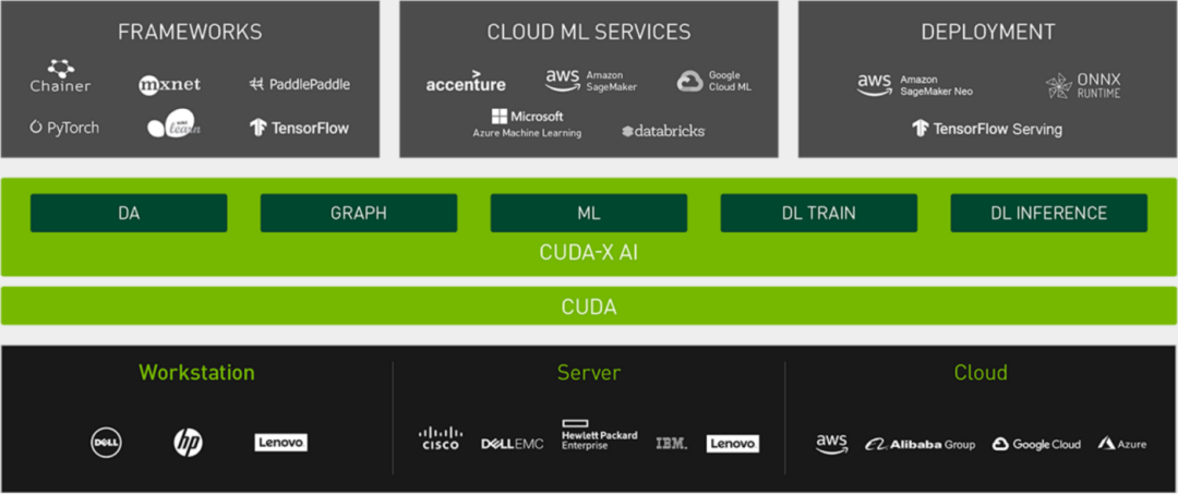 图5:NVIDIA CUDA-X生态系统概览:建立在CUDA基础之上的AI和HPC加速库集合