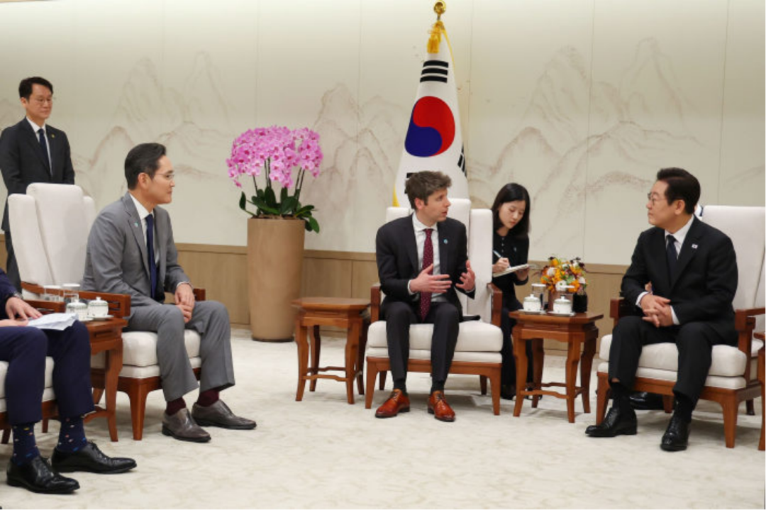 图4: Sam Altman(中)与韩国总统尹锡悦(右)、三星电子会长李在镕(左)