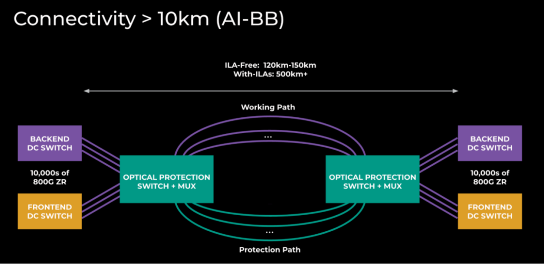 在此基础上,Meta的技术演进重点从仅适用于短距数据中心互联(<120km)的400G ZR模块,转向支持长距骨干网的新一代C+L波段800G ZR+ 相干光模块。后者通过引入更高阶的oFEC纠错算法与多速率自适应能力,原生支持1000—2000km的长距传输,具备了替代传统长途转发器、承载跨洲骨干网流量的特性。