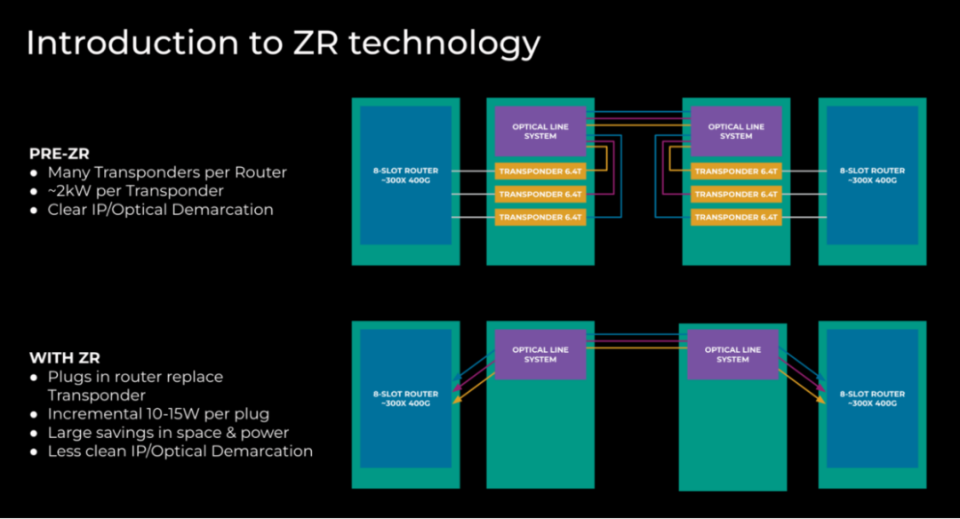 不同于传统电信级架构采用“路由器+独立传输设备(DCI-BOX)”的级联模式,Meta激进地推动了IP over DWDM(IPoDWDM)技术的全面落地:通过在路由器端口直接集成400G ZR和800G ZR+ 相干光模块,彻底消除了中间的传输设备层级,实现了物理架构的极简与扁平化。
