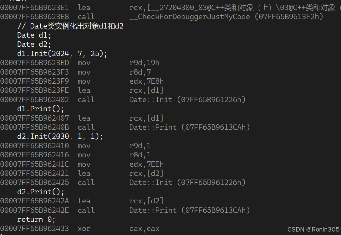 分析一下类对象中哪些成员呢?类实例化出的每个对象,都有独立的数据空间,所以对象中肯定包含成员变量,那么成员函数是否包含呢?首先函数被编译后是一段指令,对象中没办法存储,这些指令存储在一个单独的区域(代码段),那么对象中非要存储的话,只能是成员函数的指针。再分析一下,对象中是否有存储指针的必要呢,Date实例化d1和d2两个对象,d1和d2都有各自独立的成员变量_year/_month/_day存储各自的数据,但是d1和d2的成员函数Init/Print指针却是一样的,存储在对象中就浪费了。如果用Date实例化100个对象,那么成员函数指针就重复存储100次,太浪费了。这里需要再额外啰嗦一下,其实函数指针是不需要存储的,函数指针是一个地址,调用函数被编译成汇编指令[call 地址], 其实编译器在编译链接时,就要找到函数的地址,不是在运行时找,只有动态多态是在运行时找,就需要存储函数地址,这个我们以后会学到。