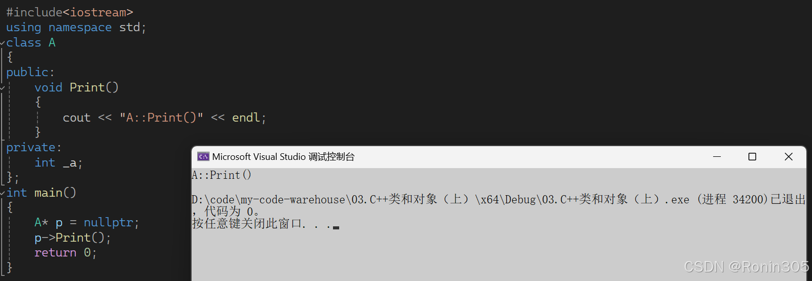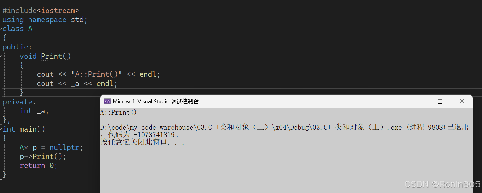 }第一题是正常运行,选C,为什么呢?这里定义了一个A类型的指针p并初始化为空指针,调用Print函数不应该是对空解引用,从而导致崩溃吗?其实并不是,因为成员函数它并不存在对象中,调用函数被编译成汇编指令[call 地址],所以并不需要对空指针解引用找到这个函数,只不过是在语法上告诉你是A类的成员函数。程序运行如下图: