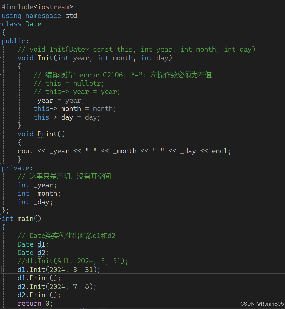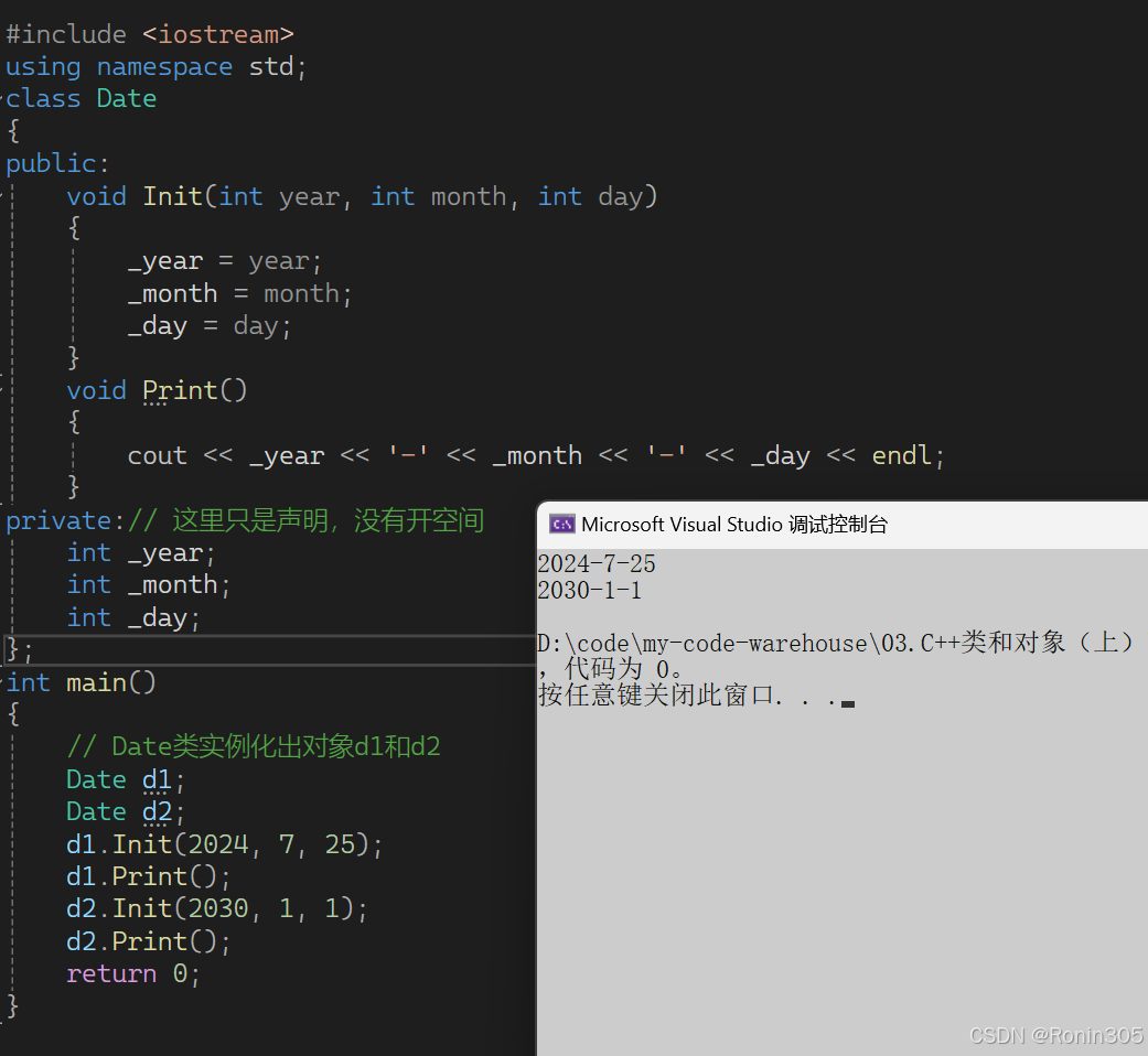 Date类中的成员变量只是声明,并没有开空间,只有在定义了Date类型的变量d1和d2时,也就是实例化对象,这个时候才会开空间。