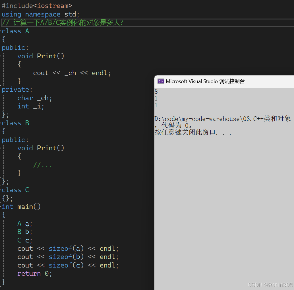 }对于a对象,成员函数不存储在对象中,所以只需要看成员变量,根据内存对齐规则(之前有讲过),可知a的大小为8字节;对于b对象和c对象呢?难道是0吗?我们来运行看一下