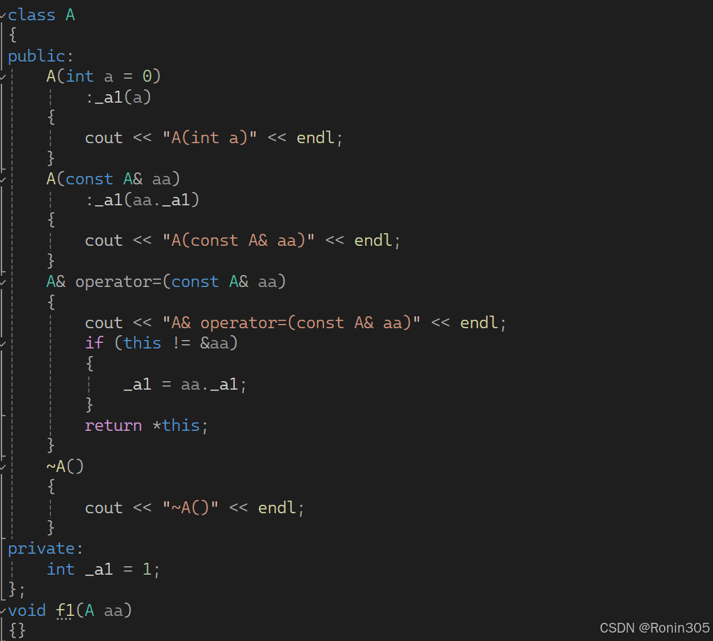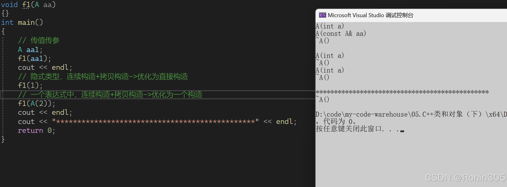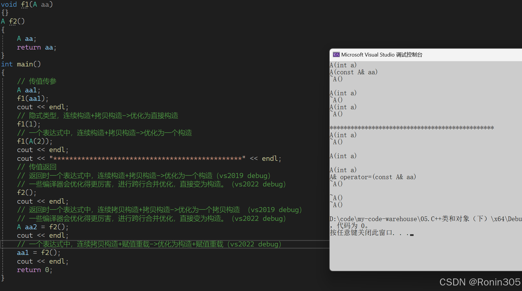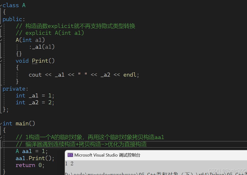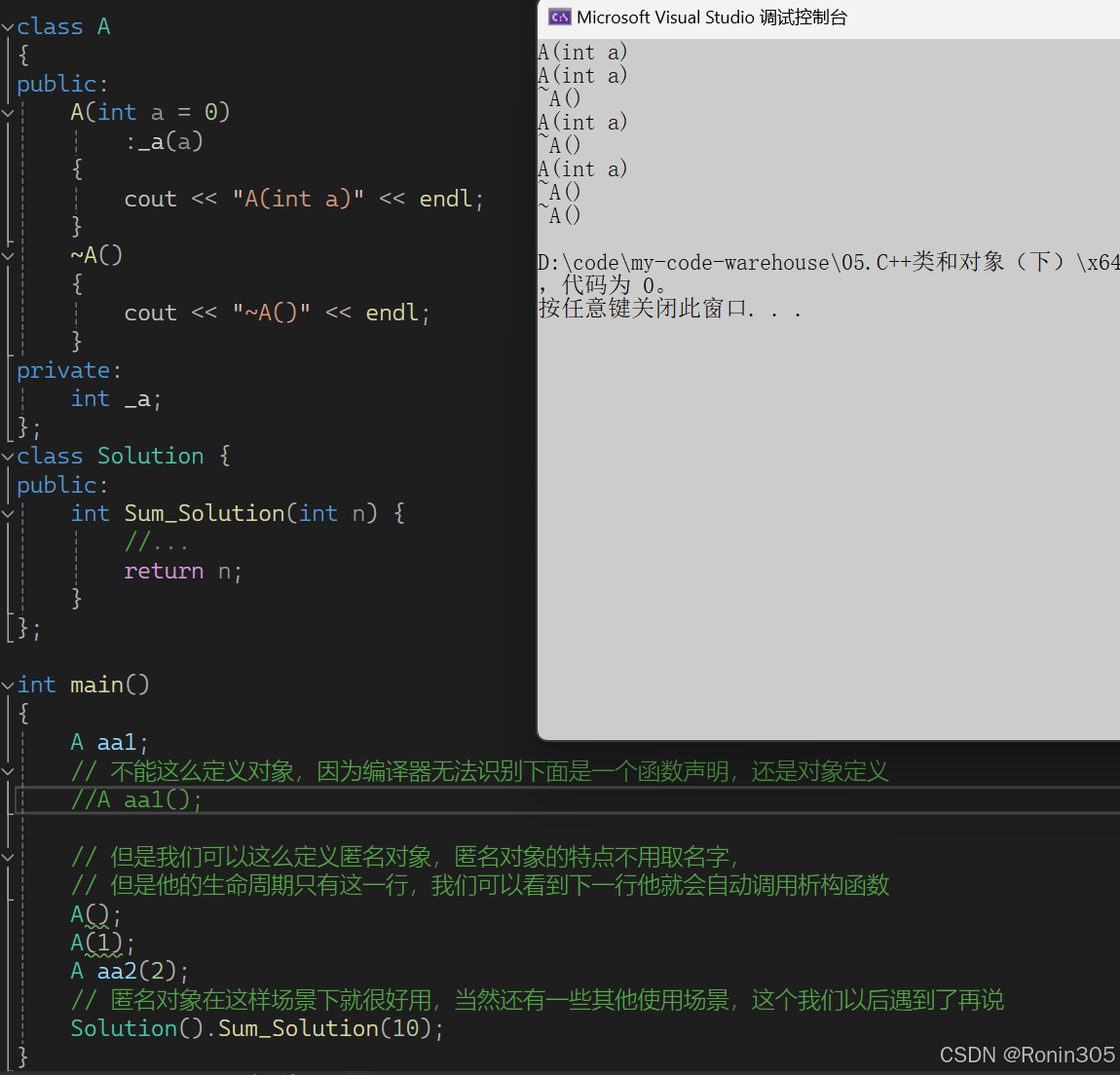 如下图,定义aa1对象调用默认构造,然后A()和A(1)的生命周期只有一行,定义的时候调用默认构造,到下一行就会调用析构,然后定义aa2对象调用默认构造,main方法结束后,后定义的先析构,所以aa2先析构,再是aa1。