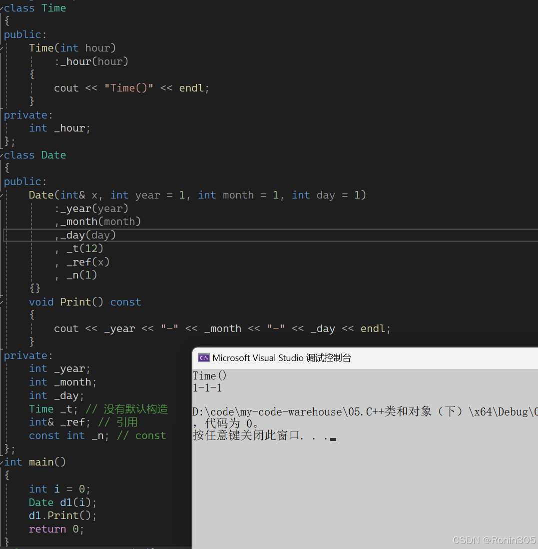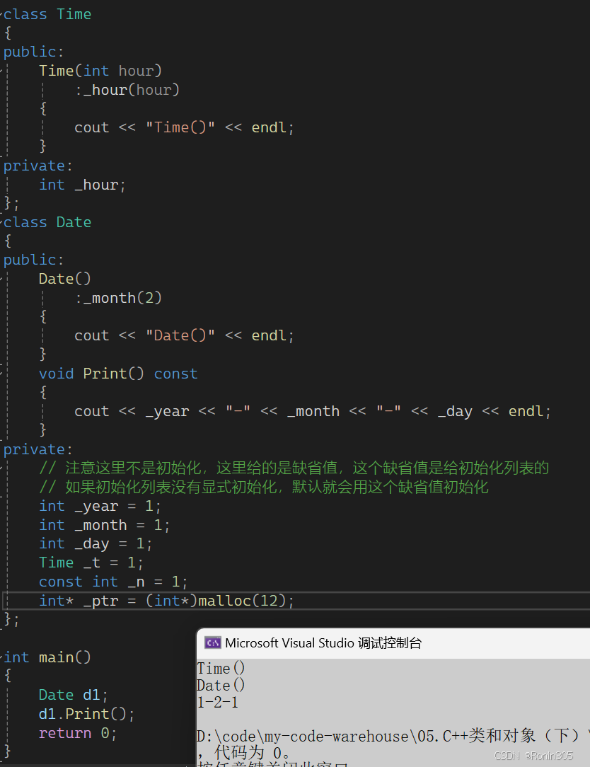 • 之前我们实现构造函数时,初始化成员变量主要使用函数体内赋值,构造函数初始化还有一种方式,就是初始化列表,初始化列表的使用方式是以一个冒号开始,接着是一个以逗号分隔的数据成员列表,每个"成员变量"后面跟一个放在括号中的初始值或表达式。 • 每个成员变量在初始化列表中只能出现一次,语法理解上初始化列表可以认为是每个成员变量定义初始化的地方。 • 引用成员变量,const成员变量,没有默认构造的类类型变量,必须放在初始化列表位置进行初始化,否则会编译报错。 • C++11支持在成员变量声明的位置给缺省值,这个缺省值主要是给没有显式在初始化列表初始化的成员使用的。 • 尽量使用初始化列表初始化,因为那些你不在初始化列表初始化的成员也会走初始化列表,如果这个成员在声明位置给了缺省值,初始化列表会用这个缺省值初始化。如果你没有给缺省值,对于没有显示在初始化列表初始化的内置类型成员是否初始化取决于编译器,C++并没有规定。对于没有显式在初始化列表初始化的自定义类型成员会调用这个成员类型的默认构造函数,如果没有默认构造会编译错误。 • 初始化列表中按照成员变量在类中声明顺序进行初始化,跟成员在初始化列表出现的的先后顺序无关。建议声明顺序和初始化列表顺序保持一致。