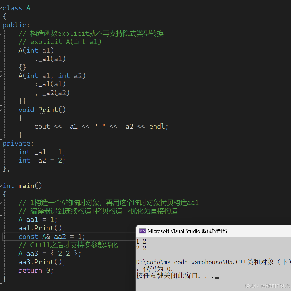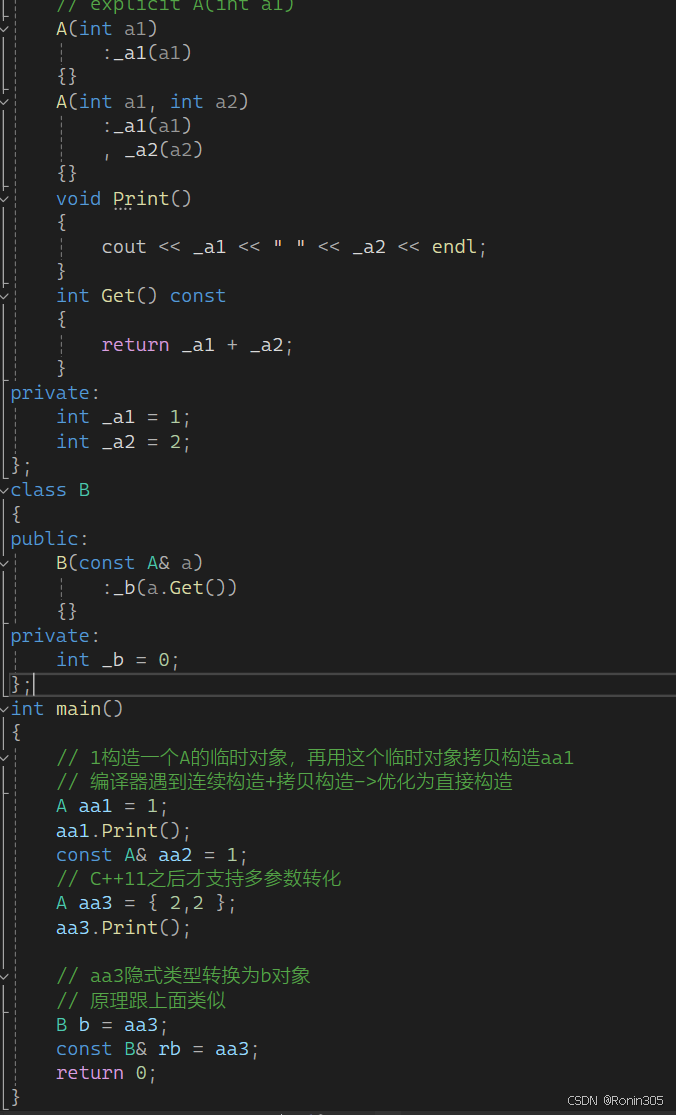 下图中引用也是隐式类型转换,但是必须得加上const,因为隐式类型转换要创建临时变量,而临时变量具有常性,所以要加上const 修饰,另外C++11之后支持多参数转化,但要使用花括号{}。