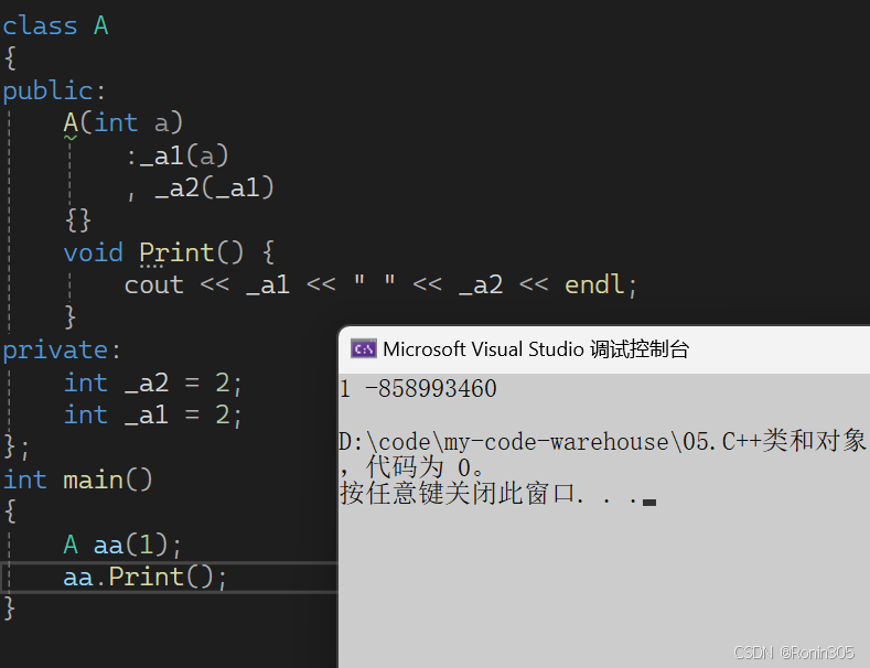 因为初始化列表中按照成员变量在类中声明顺序进行初始化,跟成员在初始化列表出现的的先后顺序无关。所以_a2先初始化,但是_a2用_a1来初始化,此时_a1未初始化,是随机值,所以_a2被初始化为了随机值。