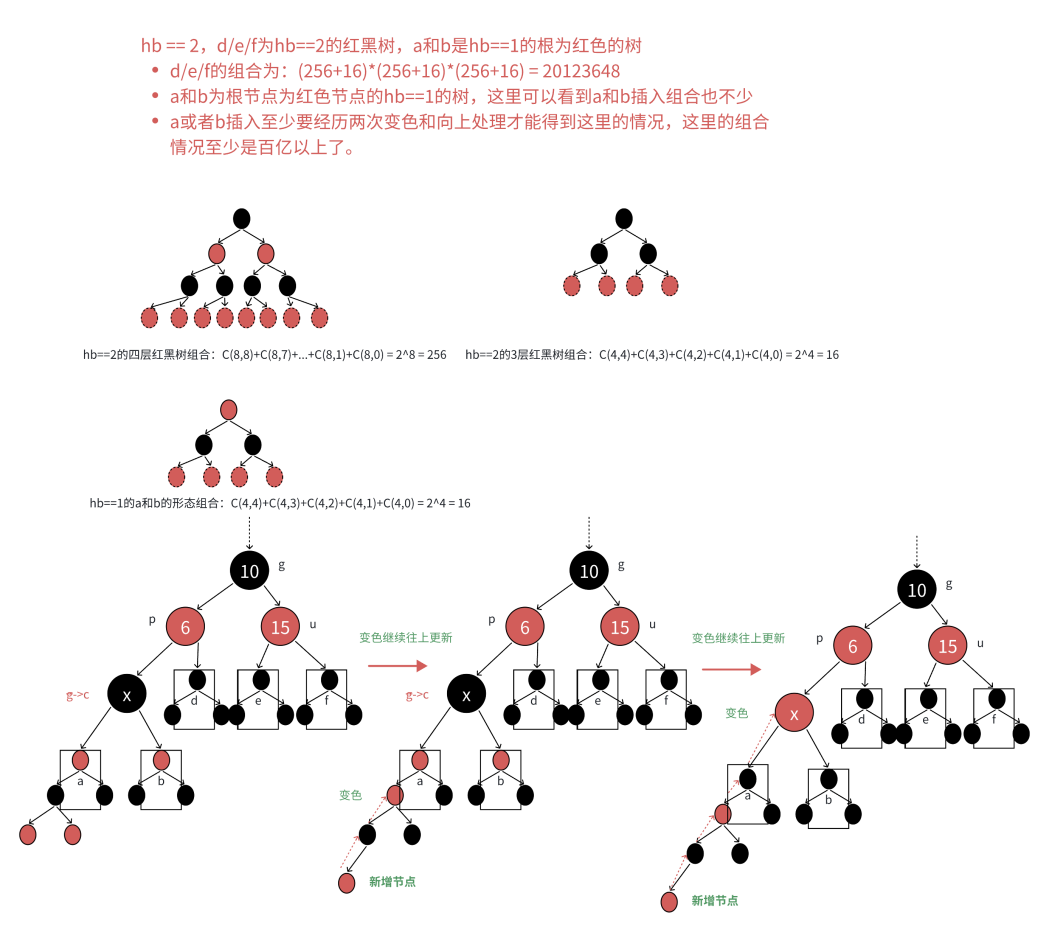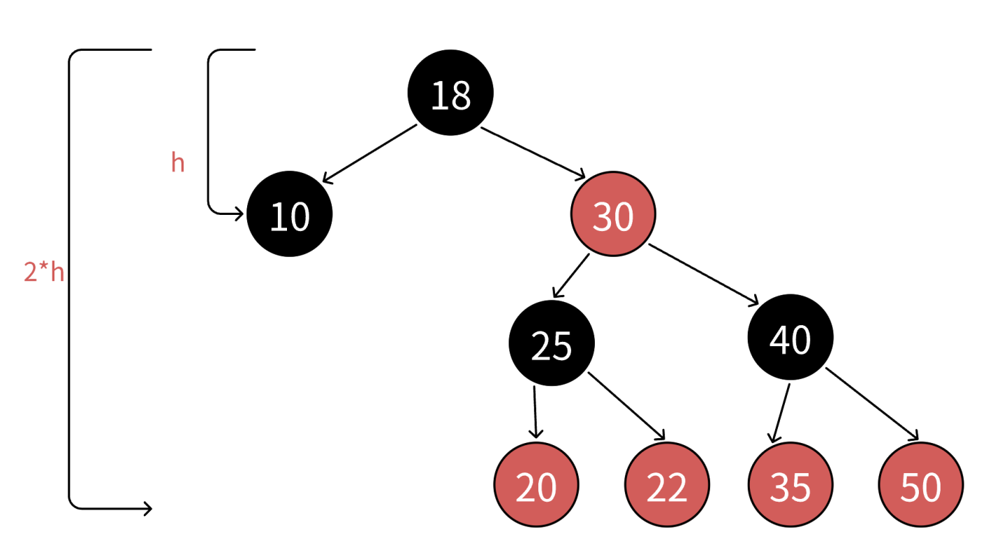 这个不等式右边2^(2h)是因为红黑树的最长路径可能达到2h(红黑交替)。通过数学推导可得树的近似高度范围: h ≈ log₂N → 2log₂N