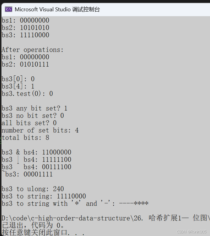 std::bitset<8> bs3("11110000"); // 字符串初始化: 11110000