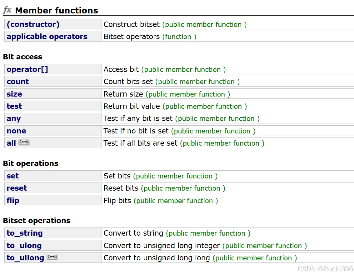 构造函数 | 创建bitset | bitset<8> bs; bitset<16> bs(0xABCD); |