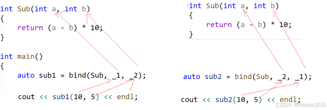 cout << sub2(10, 5) << endl; // 输出: (5-10)*10 = -50sub2(10, 5) → Sub(5, 10)