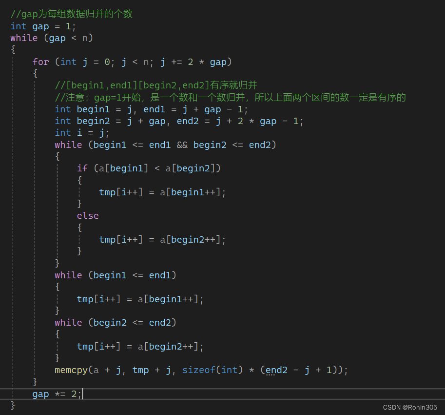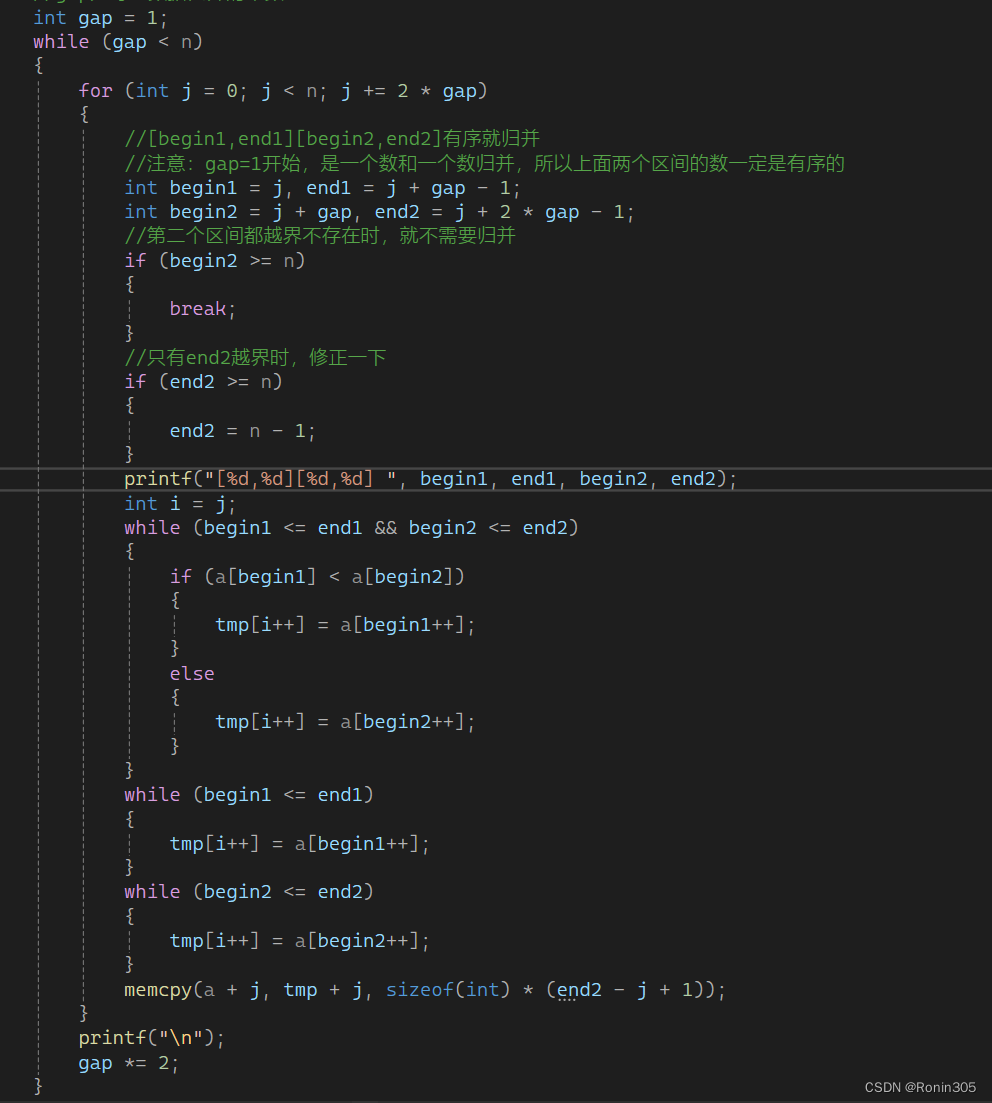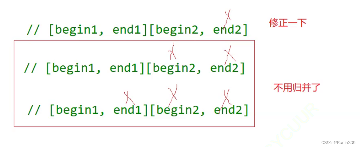 只有end2越界时,是所有数据进行归并,我们只需要修正一下end2就行:第二种情况,则是后面的数据中,不足一个区间的数,那我们就不需要就行归并,因为它就是有序的,等到下一次区间范围更大时,也就是包含那组越界的区间数据时再归并
