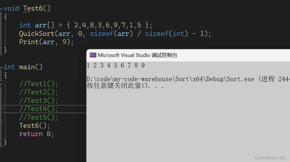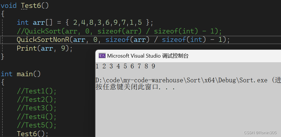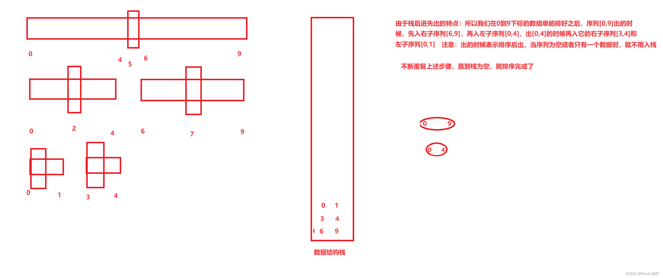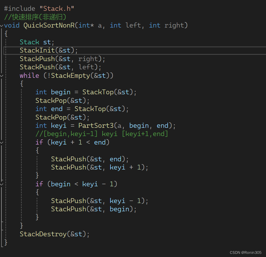这里我们的栈实现的是整型数字的操作,在上图中,我们提到的是一个区间的序列入栈出栈,这里也可以将整型修改为结构体类型来实现区间的入栈出栈,但是没有必要,我们可以一次入两个数字,表示他的区间,出栈的时候也一次出两个数字,这样就能得到区间,但是入栈的时候要先入区间的右边数字,再入左边数字。另外keyi+1<end和begin<keyi-1都表示区间为空或者只有一个数字,这个时候就不用入栈了。
