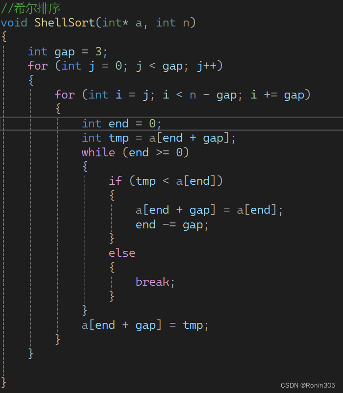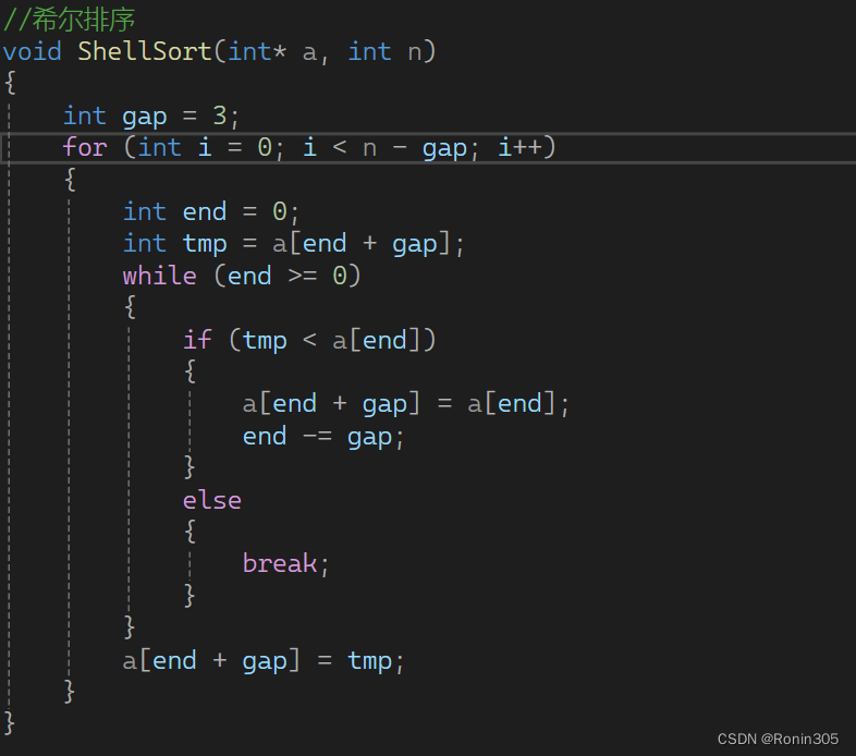 首先我们来实现一次排序,假设增量gap为3,可以发现和插入排序非常类似,只不过这里我们每次插入排序时,隔了gap个间隔。