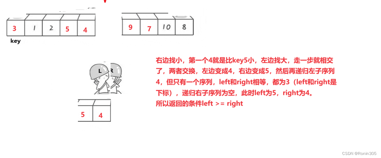 递归到最后,还剩一个序列或者为空时就返回,即left>=right,如下图举例:
