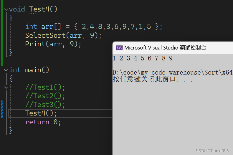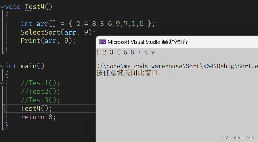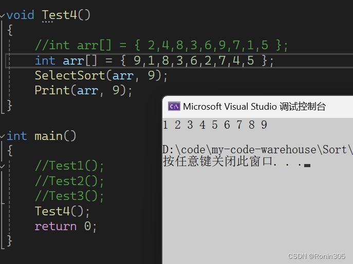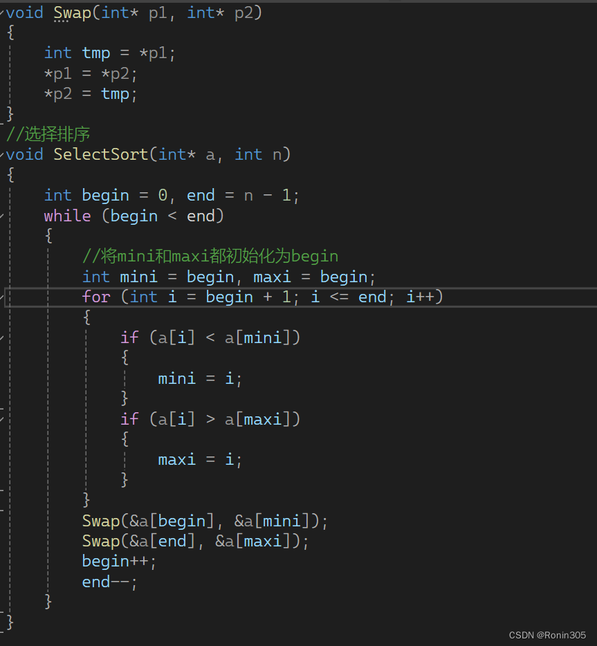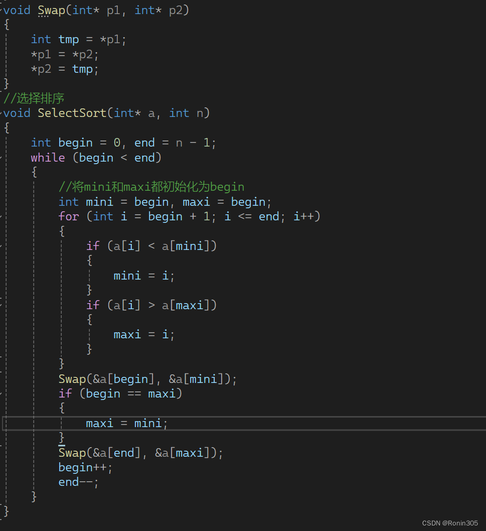 由于这种情况只有在最大值出现在0下标时才会发生,原因是在for循环中,第二个if语句是不会进入的,这样的话maxi就会一直是初始化时的begin,所以在交换完最小值后,我们先判断一下begin和maxi是否相等,相等就说明是最大值出现在下标0的情况,那我们此时就把mini的值赋给maxi,不相等就说明是正常情况,直接交换最大值。