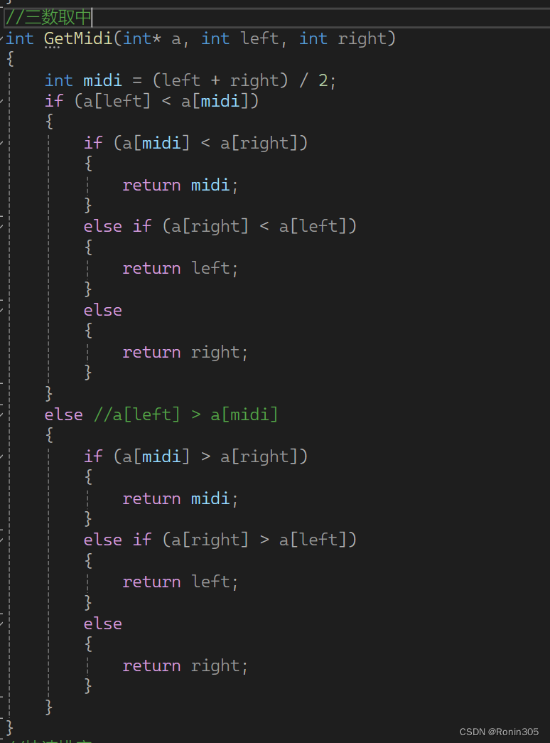 仔细思考一下,是不是只要每次都是二分的话效率就比较高,所以选key就很关键,只要选的key是一个适中的值就要好点,但我们每次选key都是最左边left位置的值,如果是有序的话,递归的深度就是N,二分的情况下递归的深度时logN,这个效率就会比较慢了,所以我们可以优化一下。这里有一个方法叫三数选中